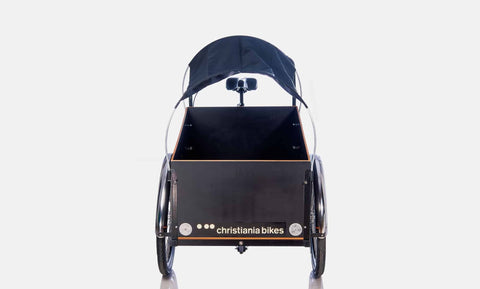 ' \n \n  \n \nThe sunroof can be used as a protective shield for the children against the rays from the sun, or it can be used as a windbreak on your Christiania Bike. The sunroof can be mounted on the Christiania Bike with two or three Prairie arches and works also good in combination with our Prairie hoods. The sunroof is made of heavy duty 400 denier colourfastness polyester. It is UV resistant and has a PU coating giving a durable water-repellent and flexible fabric. The hood is made in the EU can withstand temperatures between -25˚ to 50˚ Celsius.